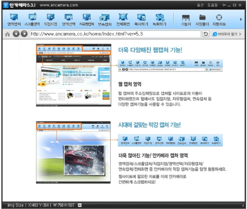 안카메라(Ancamera)는 안소프트에서 개발 배포하는 무료 화면 캡쳐 프로그램입니다. 컴퓨터 화면에 나타나는 전체 이미지를 Jpeg, Bitmap 확장자로 변환시켜 저장할 수 있으며 필요에 따라 마우스를 이용해 사용자가 지정한 크기만큼 캡처 영역을 원하는 부위만 가능합니다.