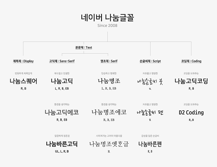 나눔 글꼴은 네이버에서 제작 및 배포하는 글꼴로서 2008년 한글날 이후 전부 무료로 전환되었습니다. 네이버는 2008년 이후로 매년 새로운 나눔 글꼴을 개발하고 있으며 현재까지는 [나눔스퀘어라운드] [나눔스퀘어] [나눔바른펜] [나눔바른고딕] [나눔글꼴에코] [나눔손글씨] [나눔고딕] [나눔명조] 등 총 8가지 나눔시리즈 글꼴이 개발되었습니다.