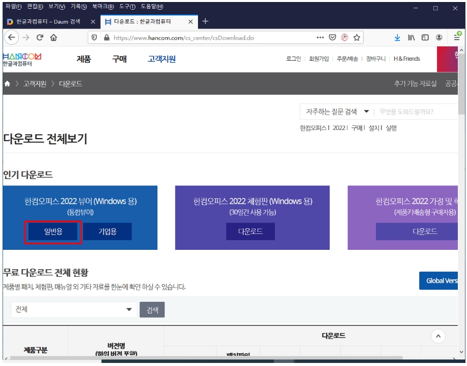 3) [한컴오피스 2022뷰어] 일반용을 눌러서 다운로드 합니다.