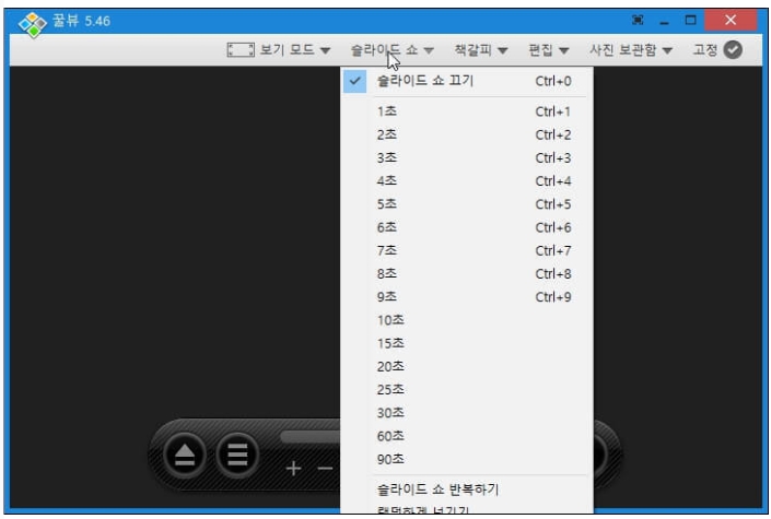 5) [슬라이드 쇼] 메뉴는 버튼을 누르지 않고 선택한 시간이 지나면 다음 사진으로 넘어가는 설정입니다. 설정시간은 1초 ~ 90초까지 원하는데로 설정이 가능합니다.