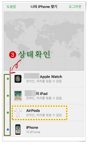 - 에어팟 상태표시가 회색점이라면 거리가 많이 이격되어 있어서 그럴 수 있기에 마지막 위치 주변을 이동하면서 활성화 여부를 체크해봅니다.