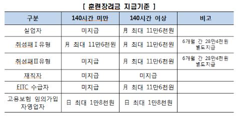 - 훈련기간 중 단위기간 출석률 80% 이상이면서 아래 요건 중 하나를 만족하는 경우, 월 최대 11만 6천원의 훈련장려금을 지급합니다.