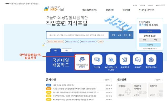 2) 직업훈련포털 HDR-Net 홈페이지에서 [국민내일배움카드] -> [발급신청]을 눌러줍니다.
