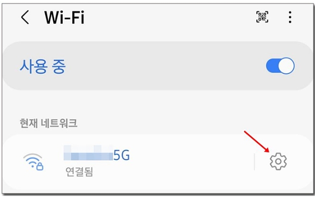 4) Wi-Fi를 선택하면 아래 현재 사용중인 네트워크가 나오는데 우측에 톱니바퀴 모양을 선택합니다.