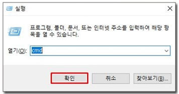 1) Windows키 + R을 눌러서 실행창을 열어준 후 실행창에 CMD 를 입력하고 확인을 눌러줍니다.