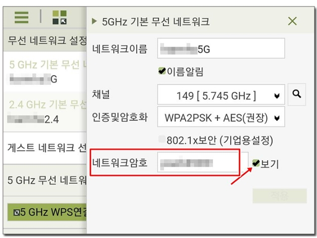 9) 무선네트워크에 들어가면 하단에 네트워크 암호에서 [보기]를 눌러주시면 암호가 보이게 됩니다.