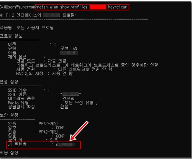 - 위 명령문을 입력하고 엔터를 누르면 아래 사진과 같이 나옵니다. 여기서 [키 콘텐츠] 항목이 와이파이 비밀번호 입니다.