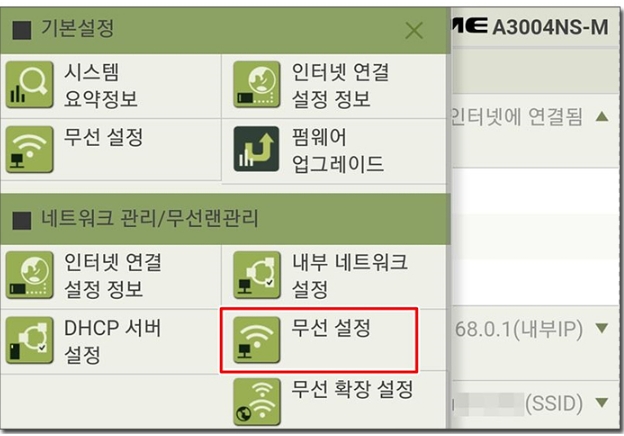 7) 공유기 설정으로 들어가셔서 메뉴를 누르면 [무선 설정]이 나옵니다.