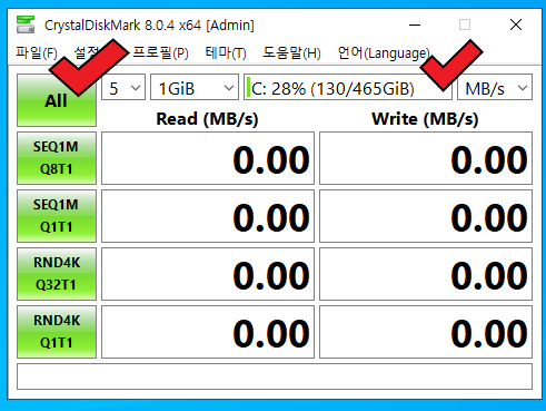 - MB/s : 읽기 / 쓰기 속도 표시 선택 항목입니다.