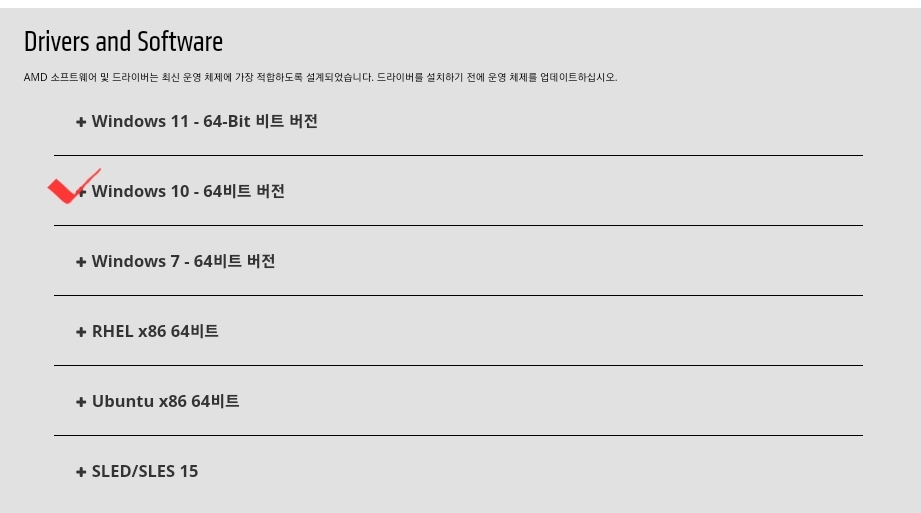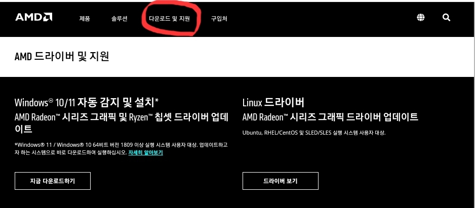 - [다운로드] -> Radeon 그래픽 및 AMD 칩셋 [드라이버] 를 클릭합니다.