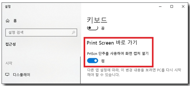 4) 활성화가 완료되면 Print Screen 키만 눌러도 Windows키 + Shift + S를 누른것처럼 캡처가 됩니다.