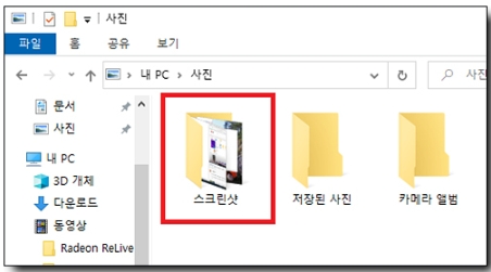 - 내 PC -> 사진 으로 이동하면 스크린샷 폴더가 생성되고 이곳에 캡처 사진이 저장됩니다.