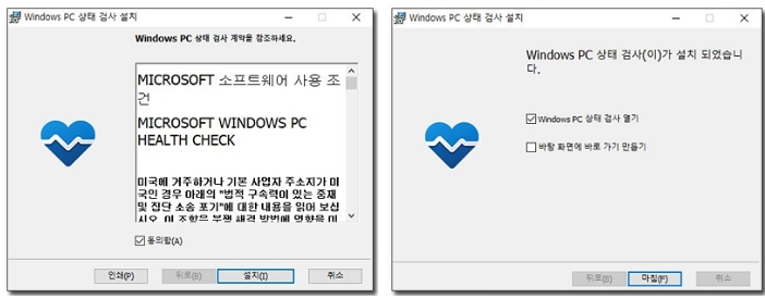5) PC 상태 검사 설치가 나오면 설치를 해주고 [Windows PC 상태 검사 열기]를 눌러 실행시킵니다.