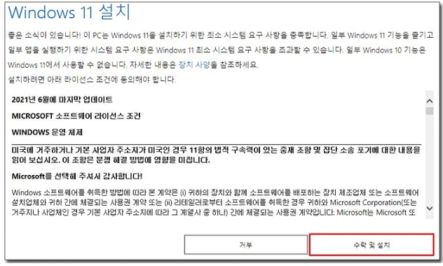 7) 이제 모든 창을 닫으시고 호환성 확인창에 새로고침을 하시면 윈도우 11 설치 창이 나옵니다. [수락 및 설치]를 누르시면 윈도우 11 업데이트가 진행되며 보통 1~2시간 정도 걸립니다.