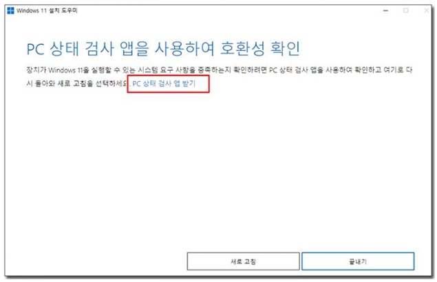 4) 호환성 확인 창이 나타나면 [PC 상태 검사 앱 다운로드]를 클릭하여 다운로드 창이 나타나면 열기를 눌러 진행합니다.