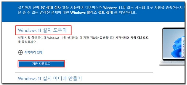 2) 마이크로소프트 홈페이지가 열리게 되면 3가지의 메뉴가 나오는데 윈도우10에서 포맷없이 업데이트를 하는 것은 [Windows11 설치 도우미]에서 [지금 다운로드]를 클릭합니다.