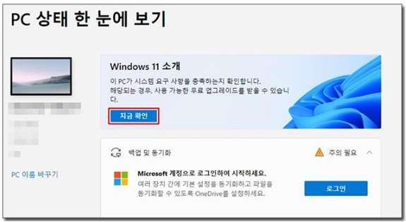 6) [PC 상태 한 눈에 보기] 창이 열리면 [지금 확인]을 눌러줍니다. 그럼 윈도우 11 업데이트가 가능한지 확인하게 되면서 [이 PC는 Windows 11 요구 사항을 충족합니다] 라고 뜹니다.