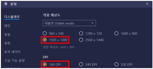 - DPI : 앱 플레이어에서 화면에 표시할 도트 수를 결정하는건데 높을수록 화질은 좋아지지만 많은 리소스를 사용하게 됩니다.