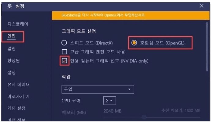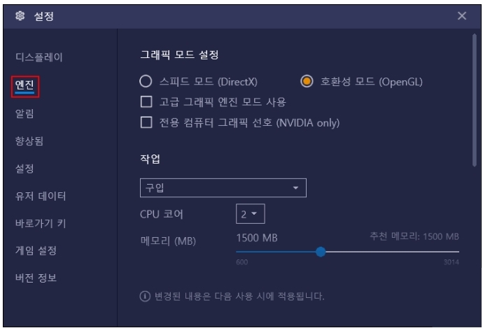 - [엔진]에서 [그래픽모드설정] 항목을 체크하시면 되는데 [호환성 모드] [전용 컴퓨터 그래픽 선호] 체크하시는걸 추천드립니다.