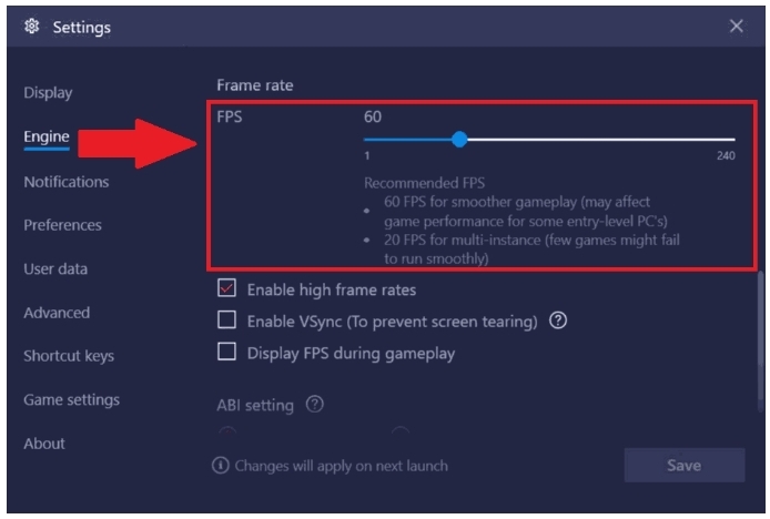 - [설정]에서 [엔진]으로 가면 프레임을 선택할 수 있는데 60FPS로 설정하는걸 추천드립니다.