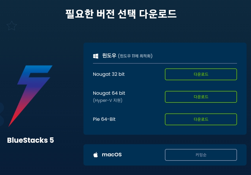 1) 위에 [블루스택5 다운로드 바로가기]를 눌러서 홈페이지에 들어가시면 [블루스택 다운로드] 라고 우측에 있습니다. 들어가셔서 Windows / Mac 중에서 본인 PC에 맞는 운영체제 버전의 블루스택5 설치파일을 다운로드 합니다.