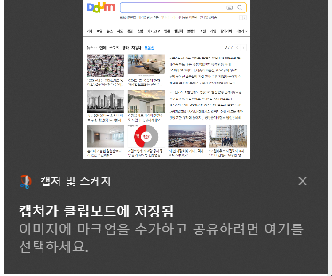 우측 하단에 [캡처가 클립보드에 저장됨] 이라고 뜨는데 그걸 클릭하면 캡처화면으로 이동하게 되며 여기서 수정 및 저장 하실 수 있습니다.