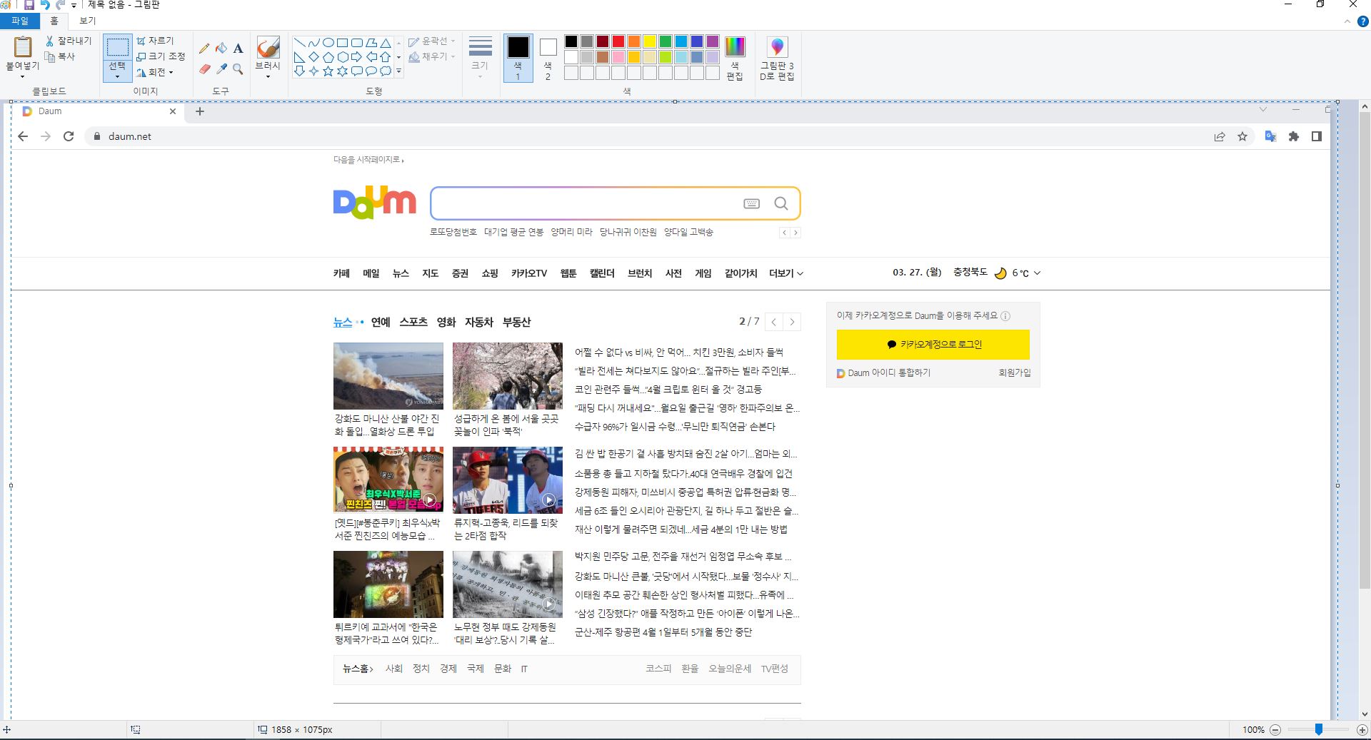- 아무런 변화 없이 내 컴퓨터 전체화면이 캡처되었습니다. 그림판을 키셔서 Ctrl + v 눌러서 붙여넣기 합니다. 아래 그림처럼 그림판에 내 전체화면이 캡처됩니다. 여기서 잘라내기로 해서 내가 필요한 부분만 잘라서 저장해서 사용하시면 됩니다.