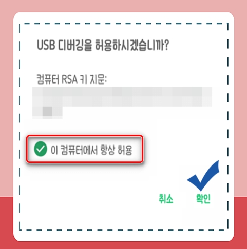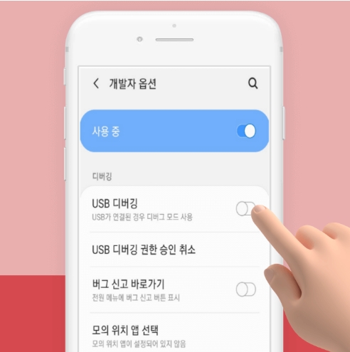 ② 휴대폰 설정 >> 개발자 옵션 >> 'USB 디버깅' 기능 활성화