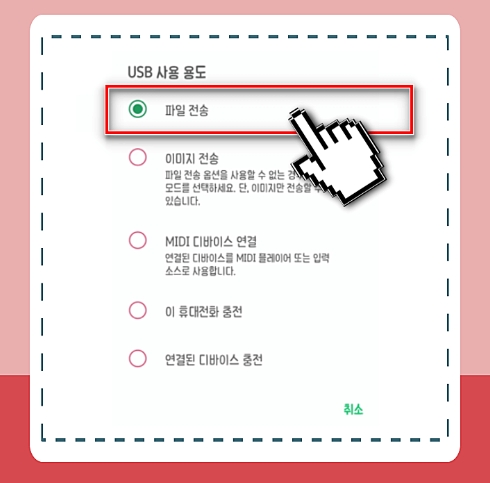⑤ 갤럭시 스마트폰을 USB로 컴퓨터에 연결 >> '파일 전송' 모드 선택
