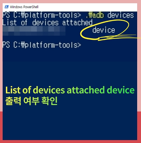 ⑦ .\adb devices 명령어 입력 >> List of devices attached device 출력 여부 확인(unauthorized 출력 시 USB 디버깅 재시도)