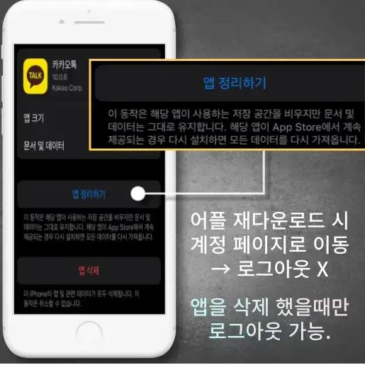 갤럭시의 경우 모바일 환경에서 데이터를 삭제하거나 앱을 삭제하는 방법으로 로그아웃이 가능하지만, 아이폰은 데이터 삭제 기능이 없기 때문에 카톡 앱을 삭제해야만 로그아웃을 할 수 있습니다. 아이폰에서 지원하는 앱 정리하기 기능을 이용해 카카오톡 어플을 정리하더라도 앱은 삭제되지만 해당 문서 및 데이터는 유지됩니다.(어플 재다운로드 시 계정 페이지로 이동, 로그아웃 X)