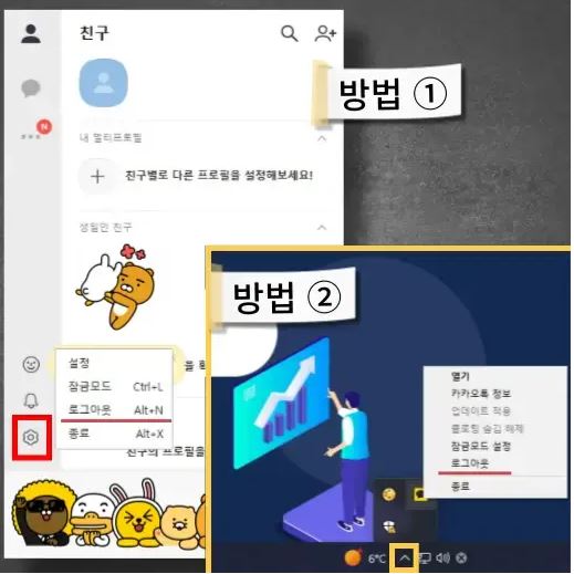 - 방법 ② : 컴퓨터 작업 표시줄에서 숨겨진 아이콘 표시(∧) 클릭 > 카카오톡 아이콘으로 마우스 커서 이동 > 우측 마우스 클릭 > [로그아웃] 메뉴 클릭 > 기기 로그아웃