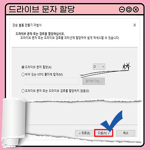 ⑥ 드라이브 문자 할당 'D' 선택 >> 다음