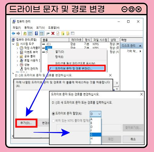 ③ D드라이브가 보이지 않는다면? D드라이브 선택 >> '드라이브 문자 및 경로 변경' >> 추가 >> 드라이브 문자 할당 'D' 선택 >> 확인