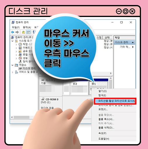 ② 디스크 관리 >> 디스크 할당량 영역 마우스 이동 >> 우측 마우스 >> '파티션을 활성 파티션으로 표시' 항목 클릭'드라이브 문자 및 경로 변경' 항목 클릭
