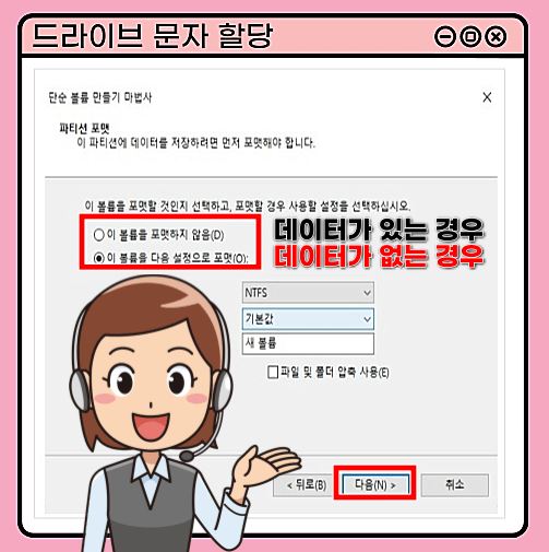 ⑦ 데이터가 있는 경우라면, '이 볼륨을 포맷하지 않음' 선택/데이터가 없다면, '이 볼륨을 다음 설정으로 포맷' 선택 후 '다음' 버튼 클릭