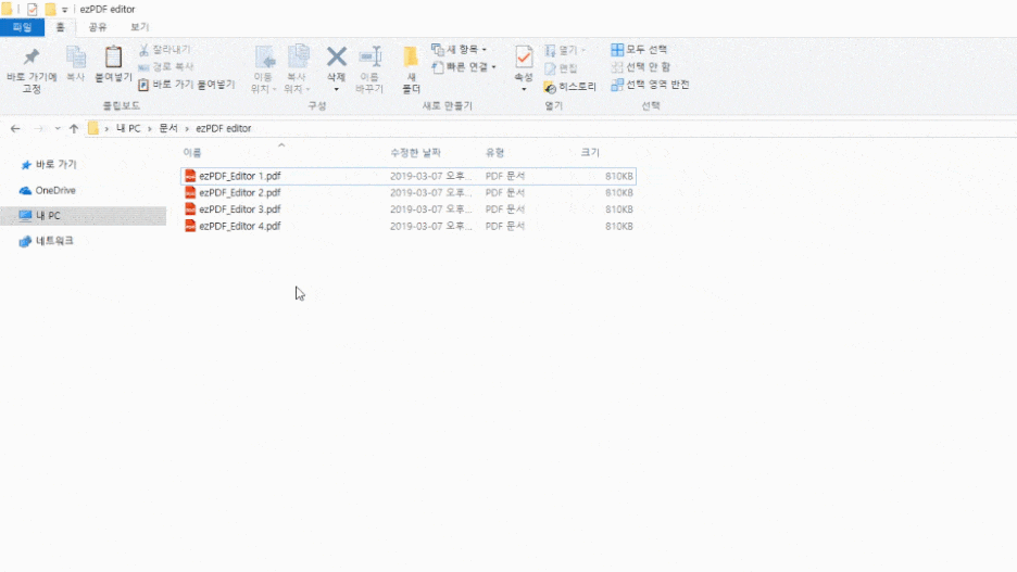 A. ezPDF Editor 내에서는 여러개의 파일을 열 수 없습니다. 하지만 윈도우 내 파일 목록에서 여러개를 선택한 후 마우스 우클릭 -> 열기 를 눌러보세요.