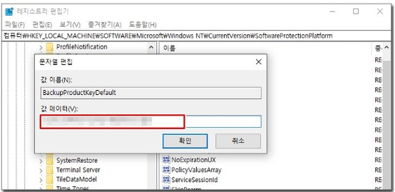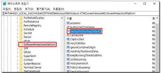 SoftwareProtectionPlatform을 찾아 클릭해 주시고 오른쪽 메뉴에서 BackupProductkyeDefault를 찾아주세요. 그리고 BackupProductkyeDefault를 더블클릭해 주세요.