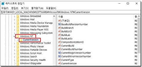 사진에는 없지만 Microsoft를 클릭해 주시고 Windows NT선택 CurrentVersion을 더블 클릭해 주세요.