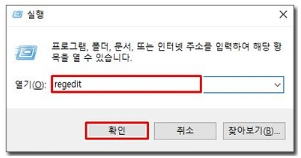 Windows키 + R키를 눌러 실행창을 열어주시고 regedit 를 입력해서 레지스트리 창을 열어줍니다.