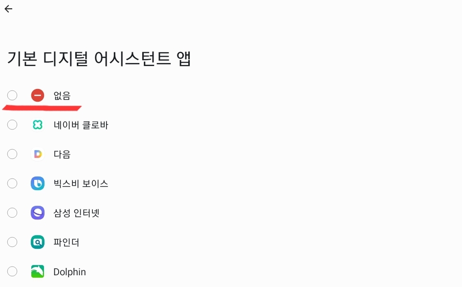 3) 디바이스 도우미앱을 열어준 후 [없음]으로 변경하면 됩니다.