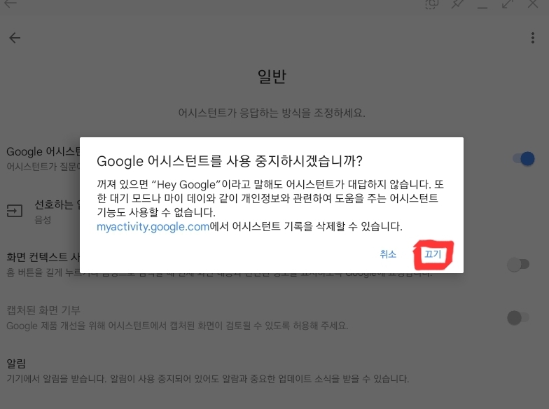 5) 구글 어시스턴트가 활성화 되어 있을 겁니다. 이걸 비활성화 시켜주시고 [끄기]를 눌러주면 됩니다.