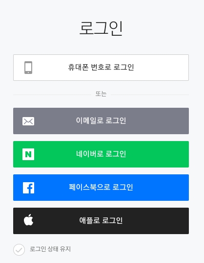 - 로그인 방법 : 이메일로 로그인 / 네이버로 로그인 / 페이스북으로 로그인 / 애플로 로그인