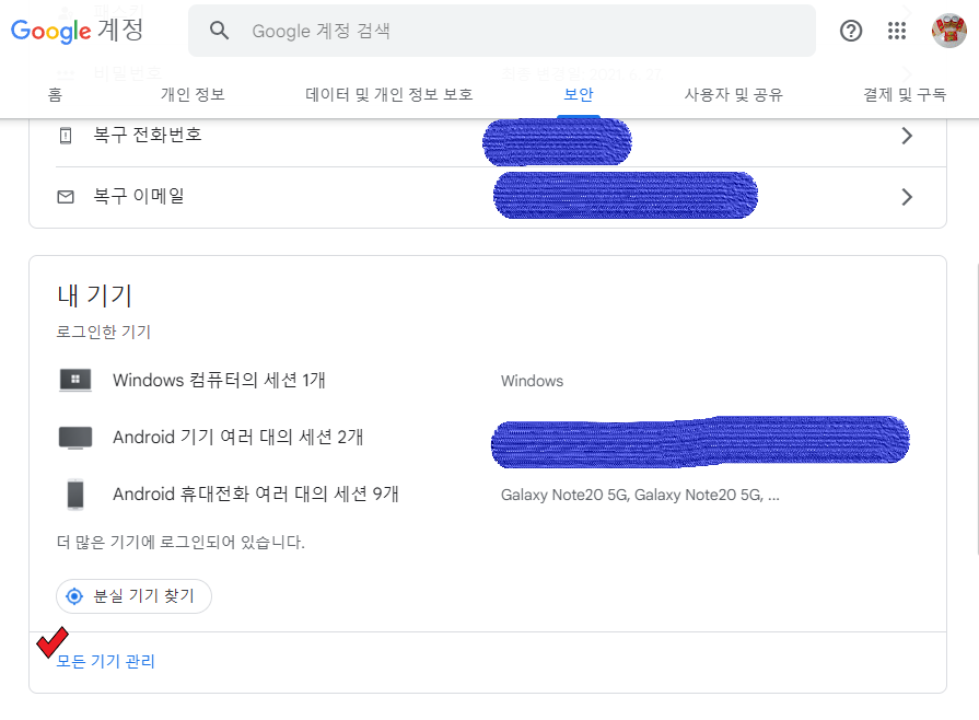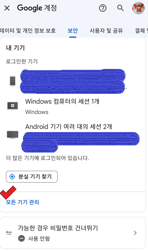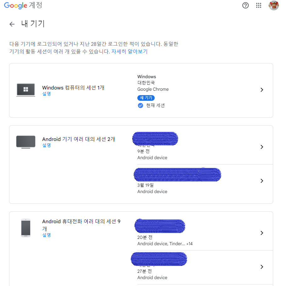 3. 현재 사용자가 구글 계정으로 로그인한 기기 목록 확인 >> 기기별로 구글 계정 로그아웃 하기