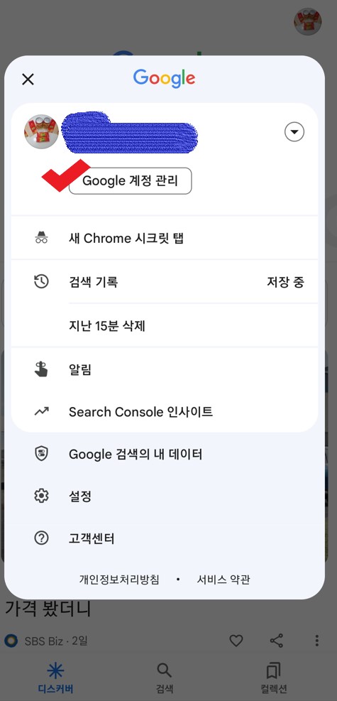 1. [구글] 앱 실행 >> 우측 상단에 위치한 [프로필 사진] 클릭 >> [Google 계정 관리] 항목 클릭
