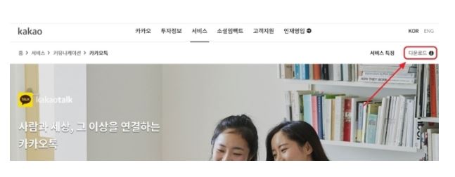 1) 카카오톡 홈페이지 우측 상단을 보시면 다운로드 서비스가 있습니다. 다운로드를 클릭합니다.