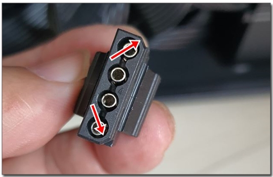 케이스 팬을 파워 케이블에 연결할 때 사진처럼 반대로 연결하는 것입니다. 당연히 반대로 연결하기 때문에 잘 들어가지 않지만 좌우로 흔들면서 결합하면 들어갑니다. 팬의 연결단자 플라스틱이 강하지 않기 때문에 들어가는데 무리가 없습니다. 이렇게 연결하면 케이스 팬이 5V의 전압으로 바뀌면서 회전 속도가 줄고 소음이 확 줄어들게 됩니다.