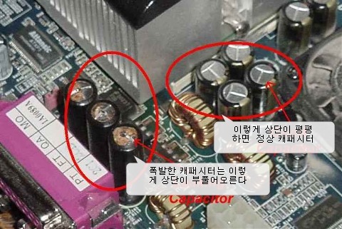 메인보드에 많은 콘덴서가 있는데 최신 PC들은 콘덴서가 캔 타입으로 문제가 발생하지 않지만 저가형 메인보드에는 캔 타입이 아닌 구형 콘덴서를 사용하는 제품이 있어서 문제가 발생하고는 합니다.