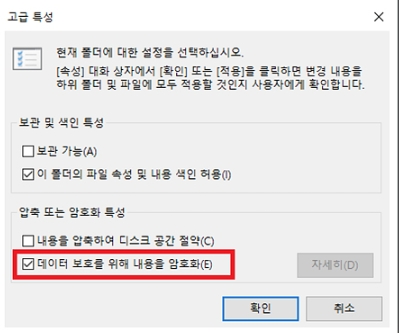 3) 고급 특성창이 열리게 되며 하단에 보면 [데이터 보호를 위해 내용을 암호화] 라는곳에 체크를 합니다.
