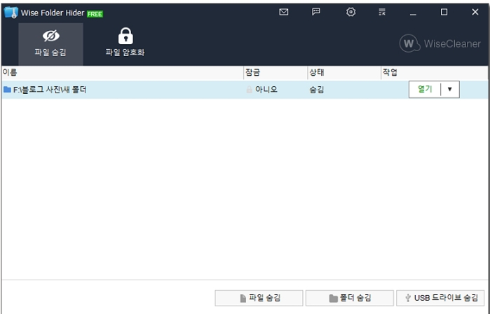 4) 비밀번호를 만들고 나면 wise Floder Hider 프로그램 창이 열리게 되며 사용방법은 프로그램 창에 폴더를 끌어서 가져다 놓으면 됩니다. 그러면 하단에 [파일 숨김] [폴더 숨김] 을 통해서 숨기실 수 있습니다.